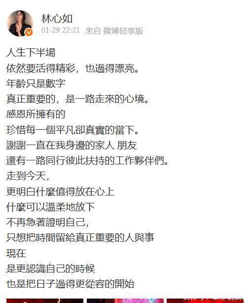 网络上祝福林心如的人不少,“生日快乐”这一句听着普通,但放在岁的这天晚上,说真的,还是挺戳人的。老去谁逃得掉啊,但能这么潇洒地当自己主角,林心如算是过出了范本。如果她今年的生日你也被感动到了,要不留言聊聊,50岁你期待什么惊喜呢?
